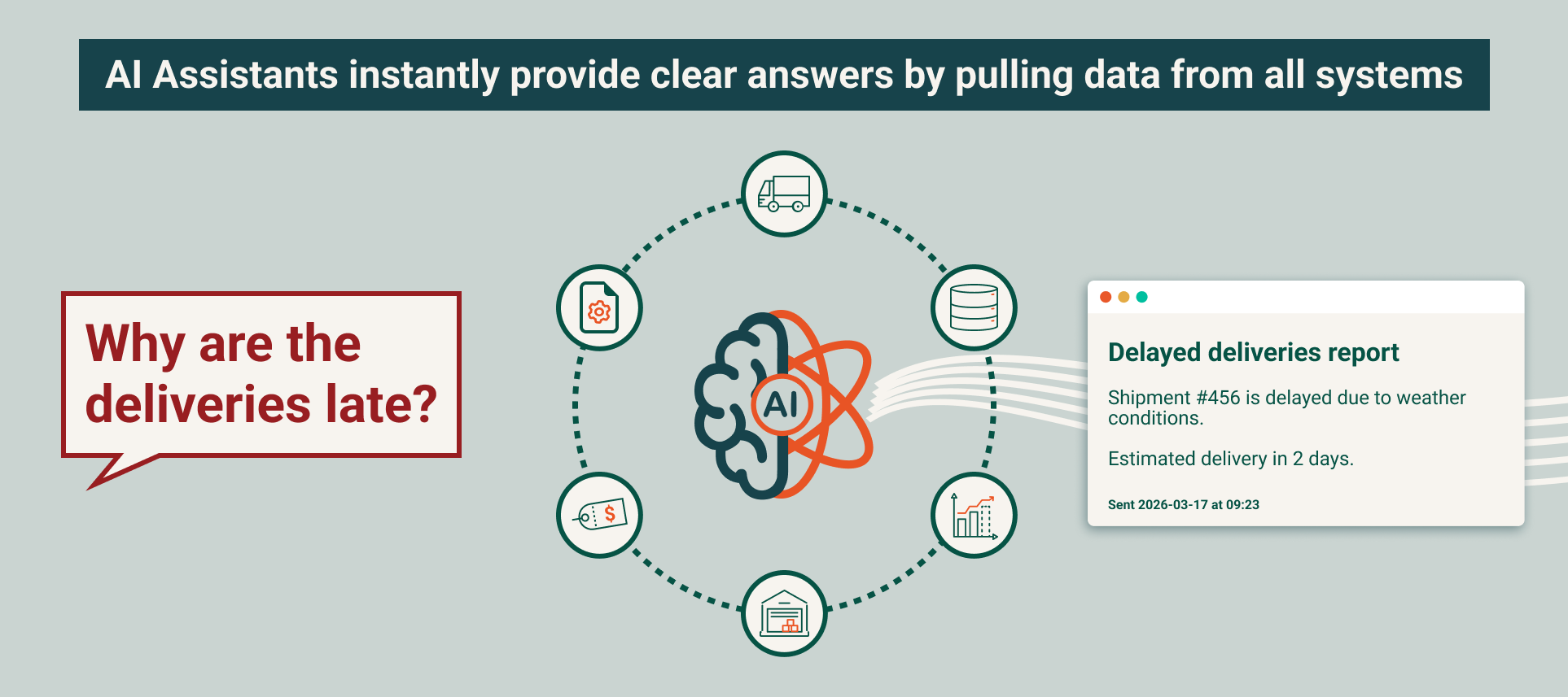 With a central intelligence layer monitoring data and activity, AI agents can also identify risks as they emerge. They detect anomalies, highlight threshold breaches, and surface policy changes. These alerts include context and suggested actions, helping users respond quickly and make more confident decisions.