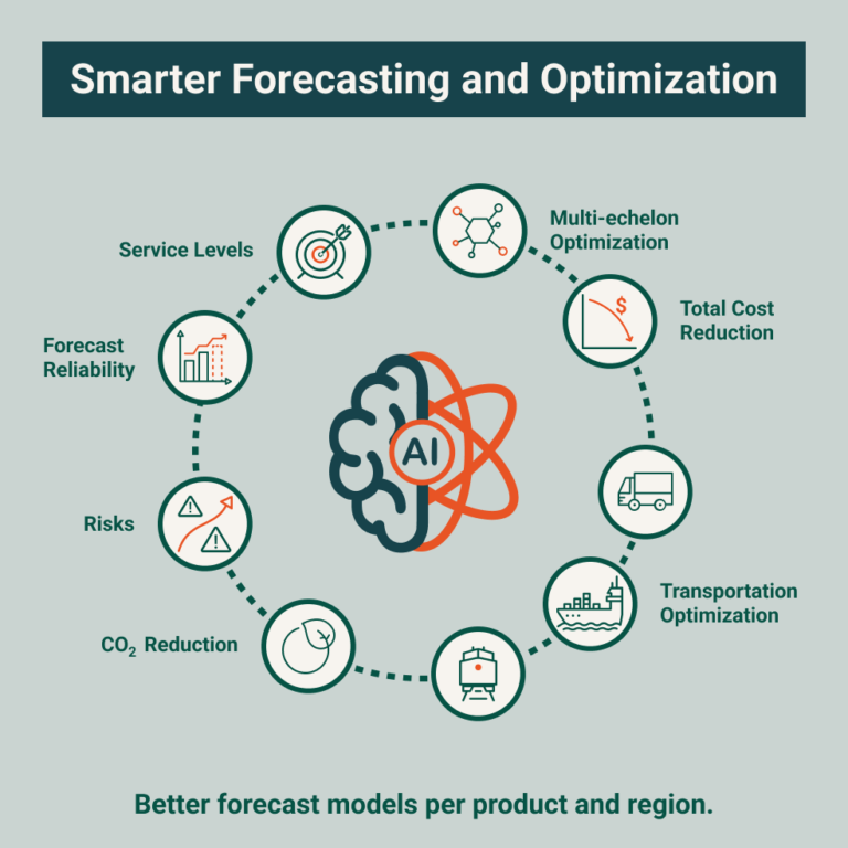 AI selects the best forecast model for each product and region. Optimization evaluates trade-offs between cost, service, risk, and sustainability across network and inventory strategies.